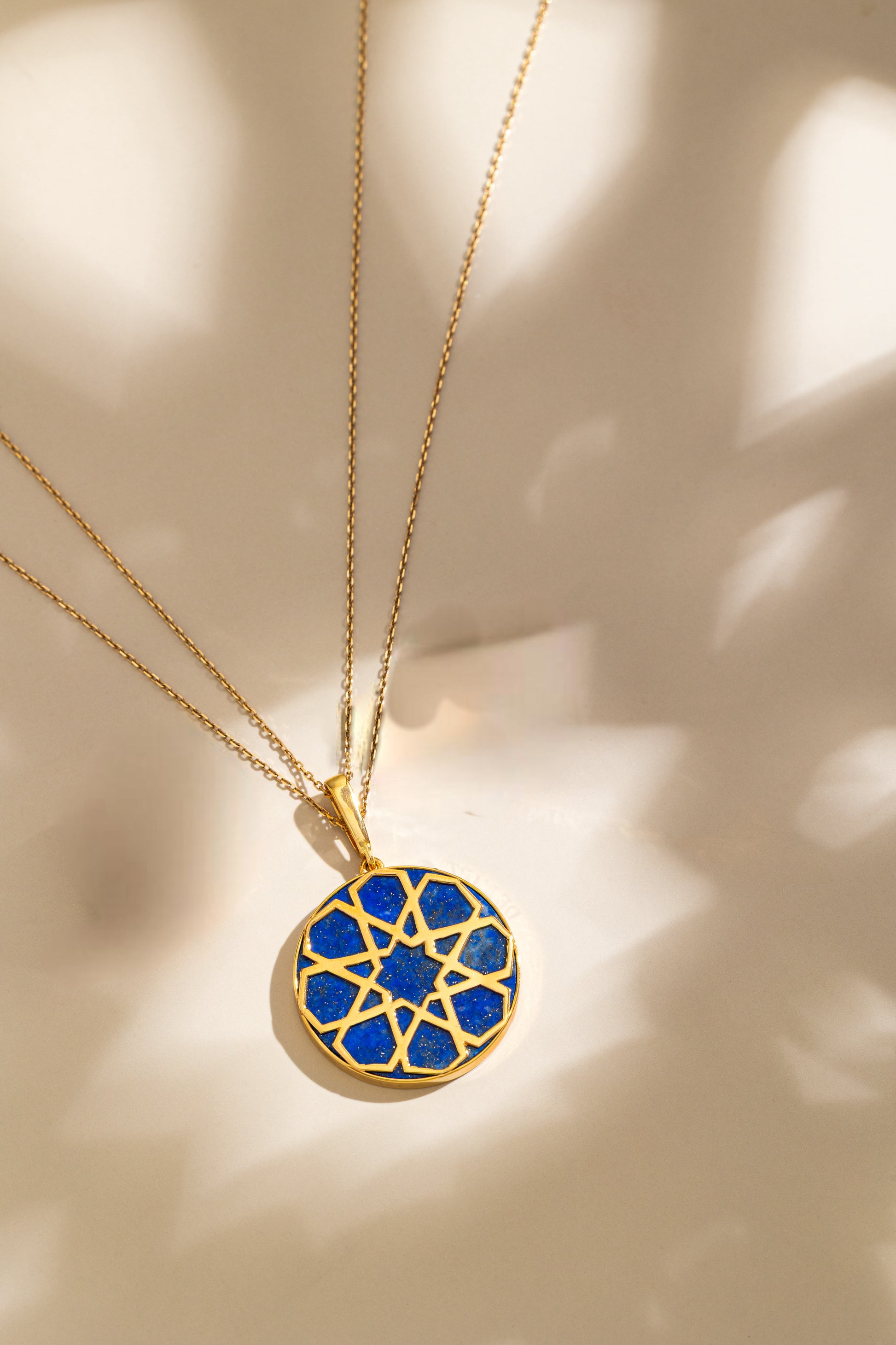 An Arabie necklace crafted in 18k yellow gold and set with natural Lapis Lazuli. Inspired by the elegance of traditional Arabic architecture, this piece embodies timeless sophistication.